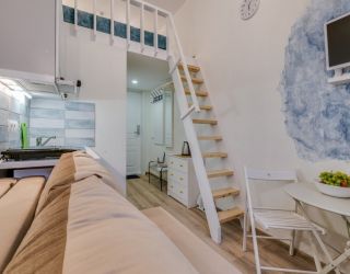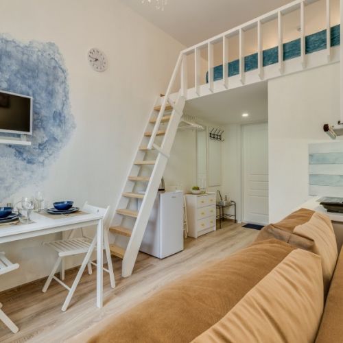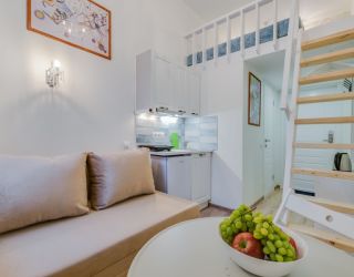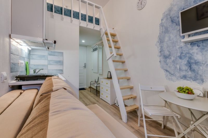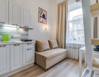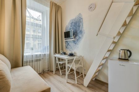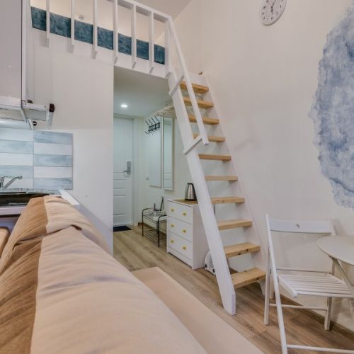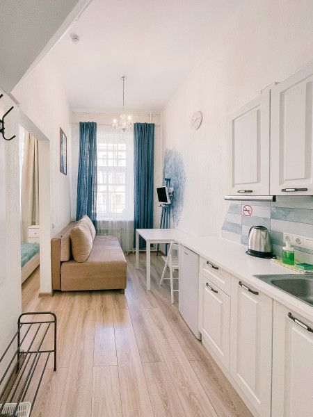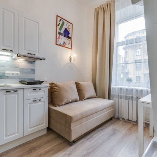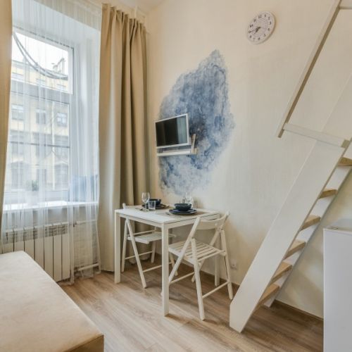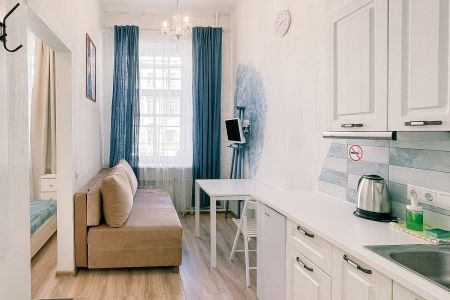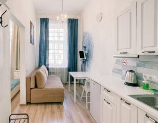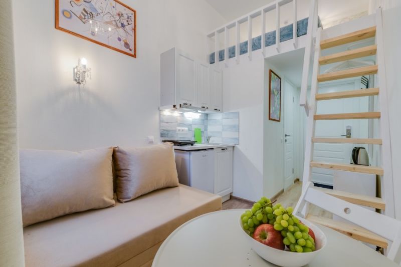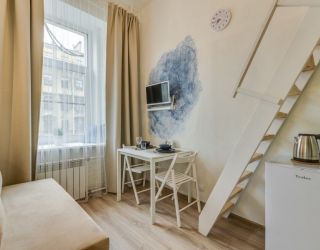 Уютные и светлые студии размещены в доме с историей: в прошлом здесь жил живописец Архип Куинджи. Припарковать автомобиль можно вдоль улицы. В здании открыты продуктовый магазин и пекарня.